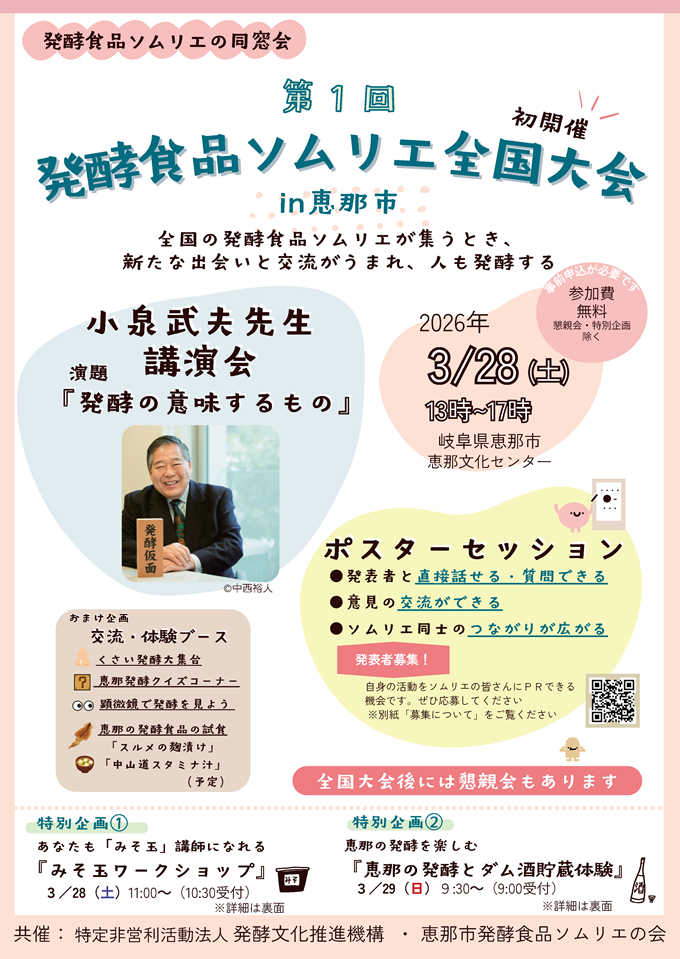 この度当機構(理事長 小泉武夫)では、第1回「発酵食品ソムリエ全国大会」を岐阜県恵那市で開催いたします。